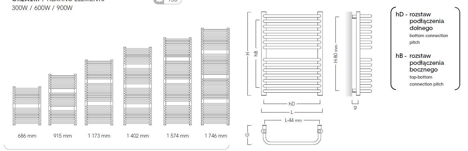• 300 × 915 mm (spodní připojení, výkon 400 W (topná tyč 400 W)