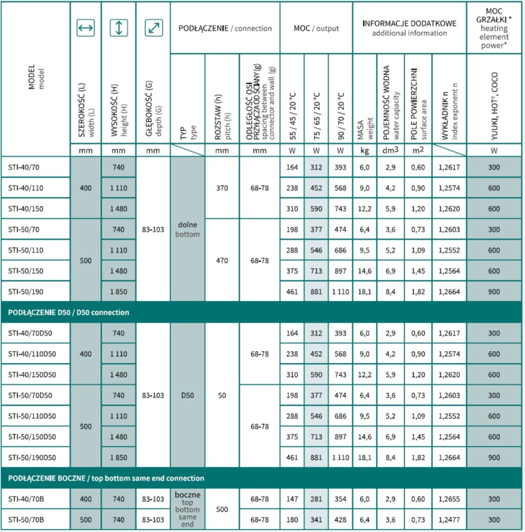 - 500 × 1110 mm, výkon 546 W (topná tyč 600 W)500 × 1850 mm, výkon 881 W (topná tyč 900 W)