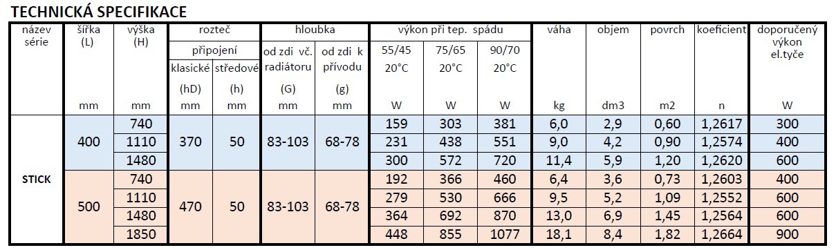 Dostupné rozměry radiátoru STICK do koupelny: