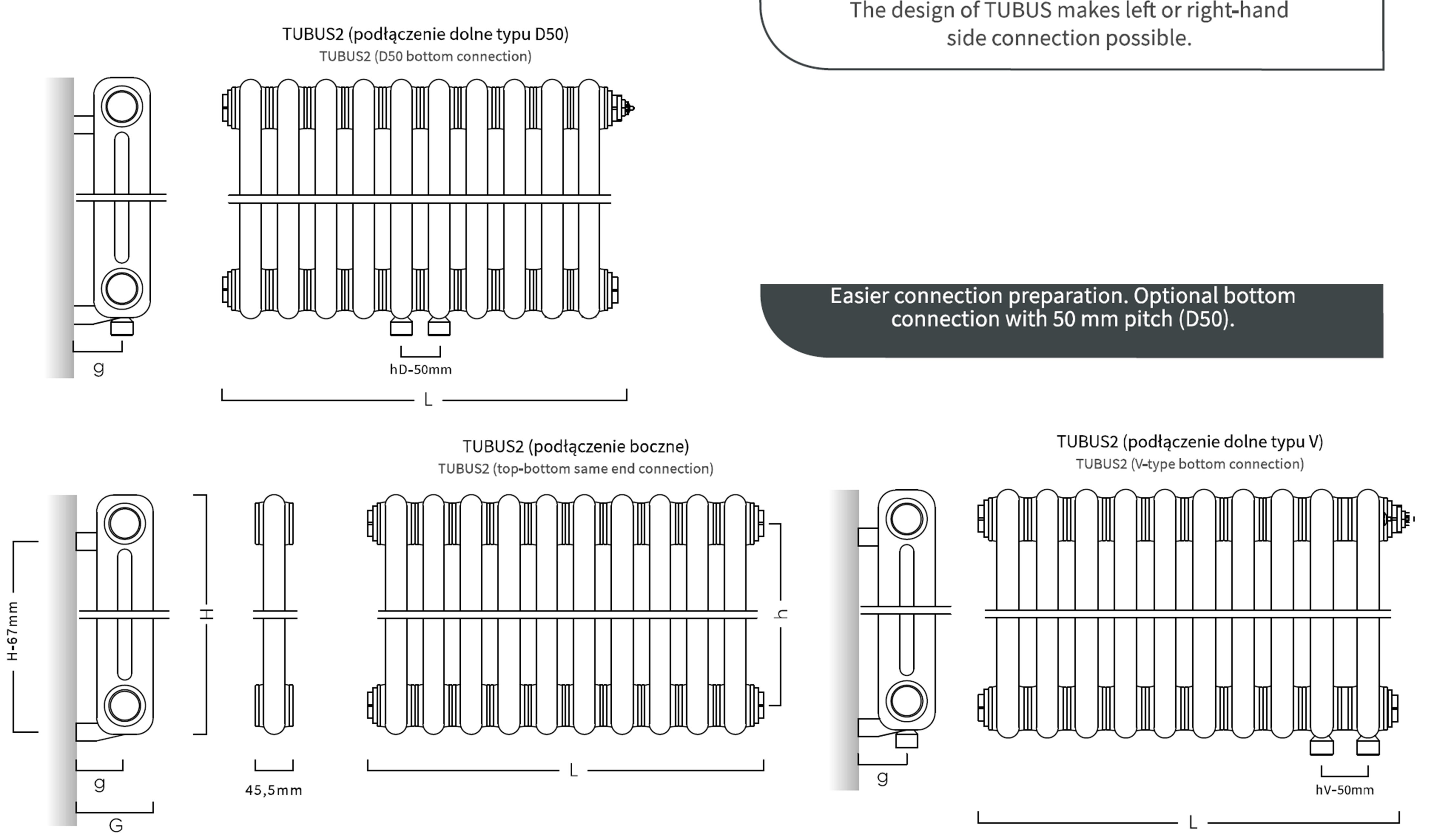 Radiátor je dodáván jak s bočním, tak i se spodním připojením D50. U spodního D50 je připojení standardně umístěno ve středu radiátoru, ale lze i případně nechat vyrobit s umístěním na pravé nebo levé straně radiátoru (nutno uvést do objednávky)