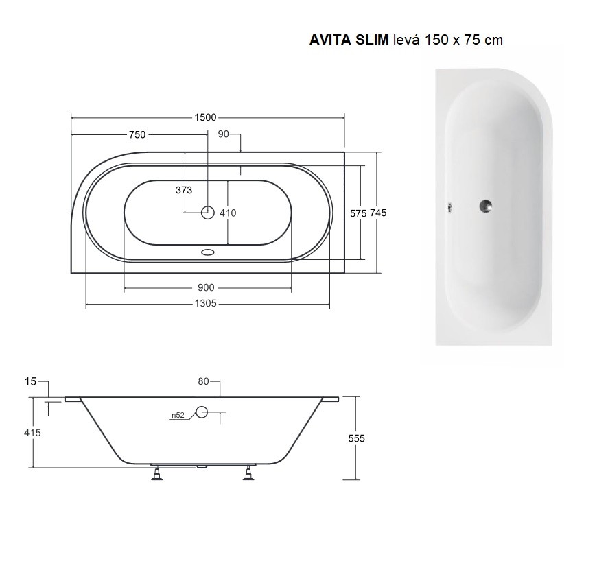 9 990,00 CZKvana AVITA SLIM 150 (1500x750 mm), levé provedení, bez nožiček