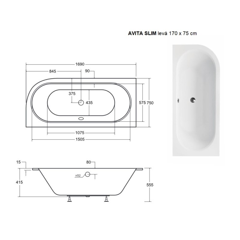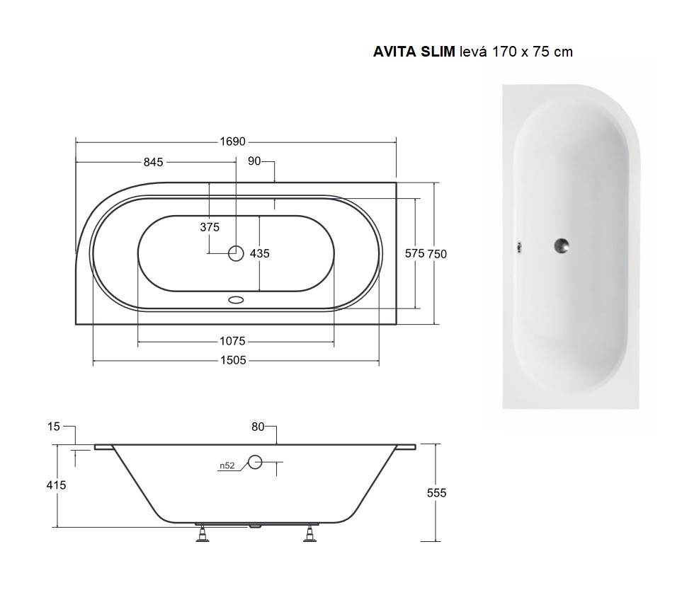 10 590,00 CZKvana AVITA SLIM 170 (1700x750 mm), levé provedení, bez nožiček