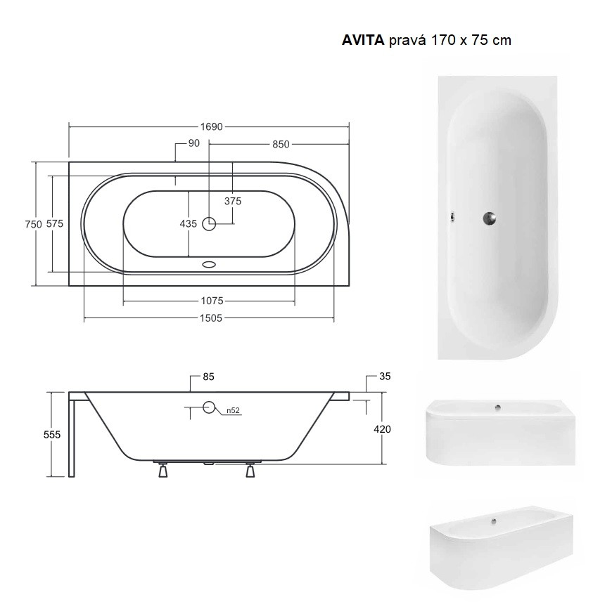 5 990,00 CZKvana AVITA 170 (1700x750 mm), pravé provedení, bez nožiček