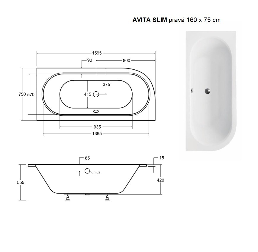 10 290,00 CZKvana AVITA SLIM 160 (1600x750 mm), pravé provedení, bez nožiček