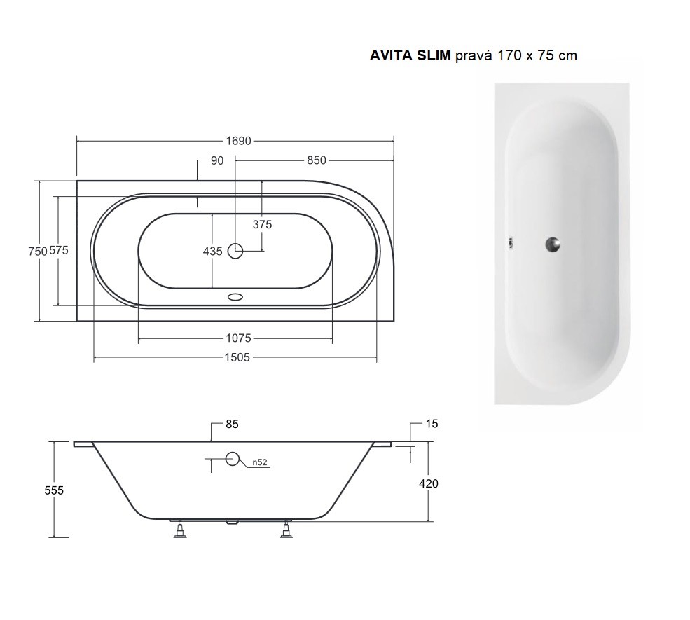 10 590,00 CZKvana AVITA SLIM 170 (1700x750 mm), pravé provedení, bez nožiček