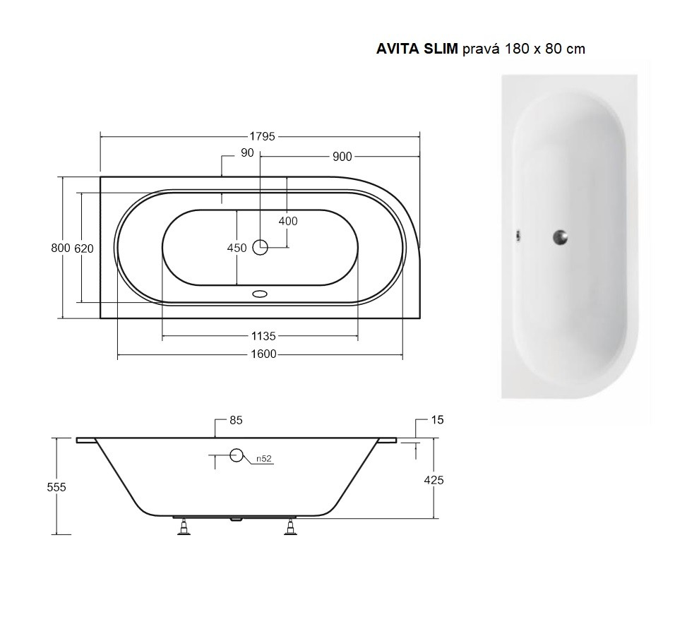 11 490,00 CZKvana AVITA SLIM 180 (1800x800 mm), pravé provedení, bez nožiček