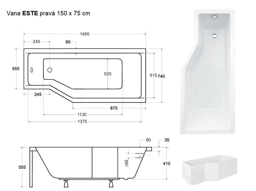 vana ESTE 150x74 cm, pravá, bez nožiček