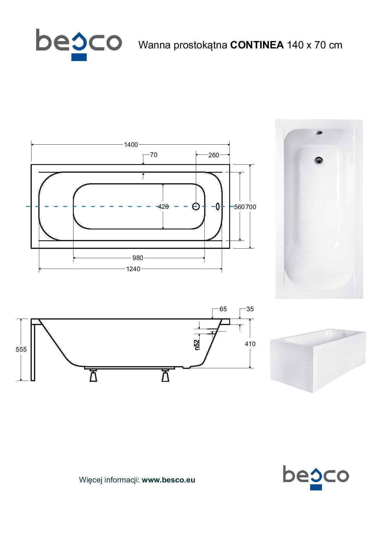 vana CONTINEA 140 (1400x700 mm), bez nožiček