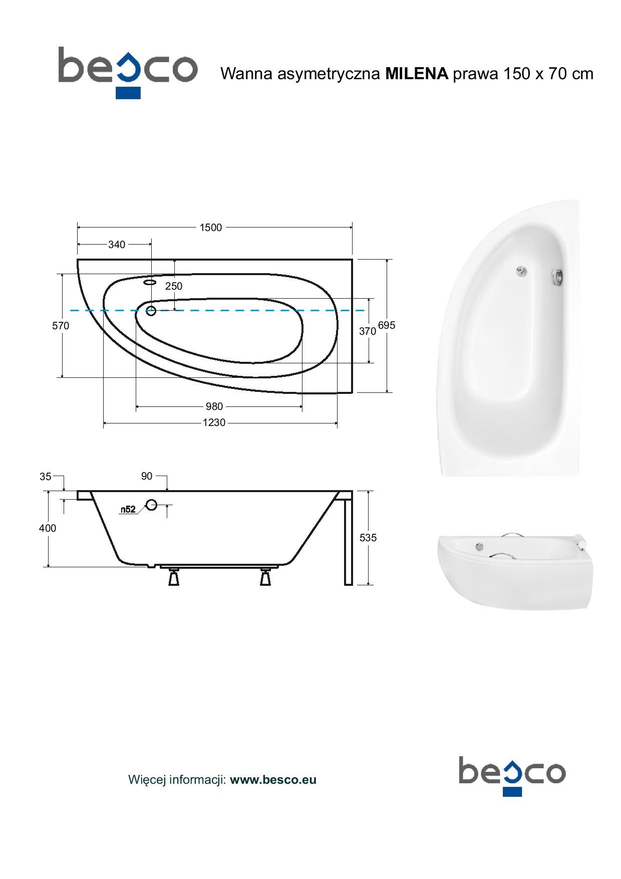 6 836,00 CZKAsymetrická vana MILENA 150 (1500x700 mm), pravé provedení, bez nožiček