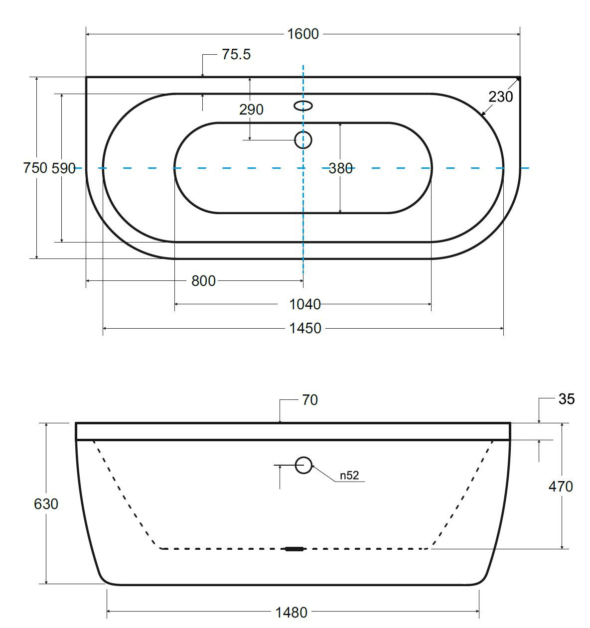 - 160 × 75 cm, objem 185 l