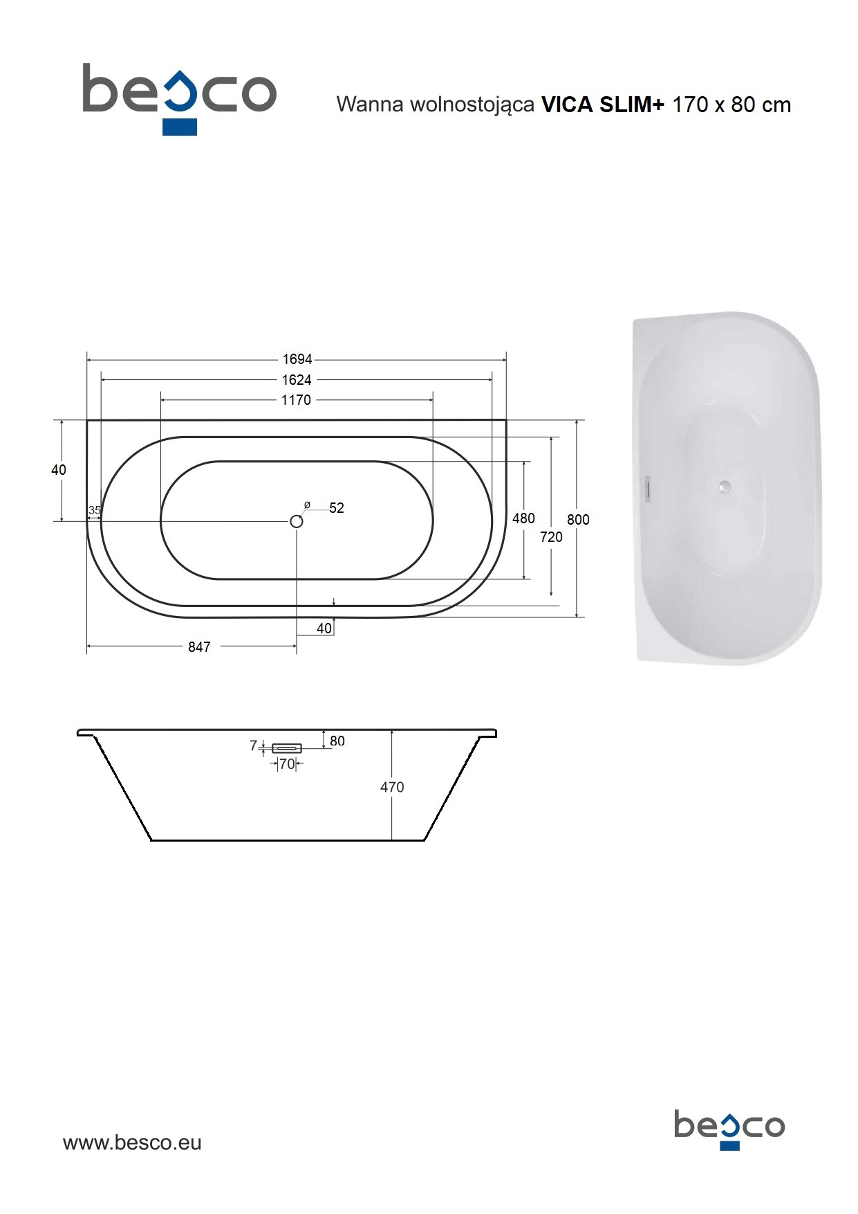 14 990,00 CZKasymetrická vana VICA SLIM+, 1700 × 800 mm, bílá barva, sifon chrom