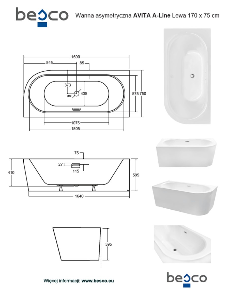 40 890,00 CZKvana volně stojící AVITA A-LINE, 1700 × 750 mm, bílá/černá barva, levé prov., sifon s přepadem chrom