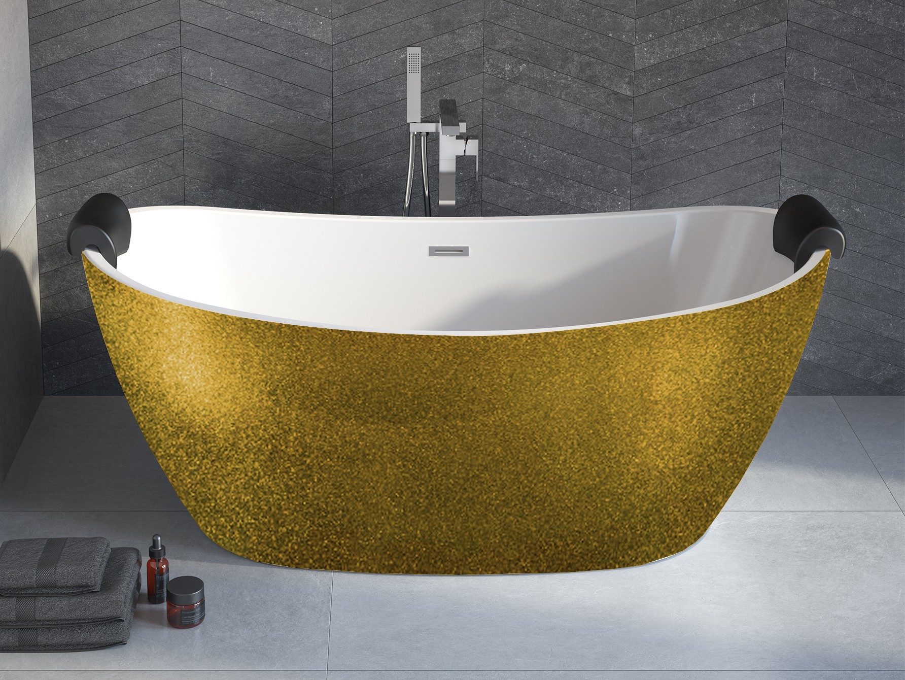 Oblé tvary, robustní a asymetrický vzhled, to je vana AYLA GLAM. Díky hmotnosti je manipulace s vanou velmi snadná. Vana i vnější plášť tvoří kompaktní celek. Čelní strana je provedena ve GLAM01 zlaté barvě, horní a vnitřní část vany v bílé barvě. Akrylátový povrch vany umožňuje jeho snadnou údržbu. Vanu není třeba obezdívat a obkládat. Součástí vany je také odtokový systém click-clack s přepadem v chromu ve standardním provedení. Dále nabízíme tyto sifony za příplatek v dalších 4 barvách (zlatá, černá, bílá a grafitová).