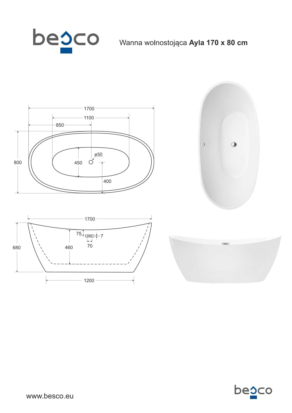 55 890,00 CZKvana volně stojící AYLA, 1700 × 800 mm, GLAM01 zlatá barva/bílá barva, sifon chrom