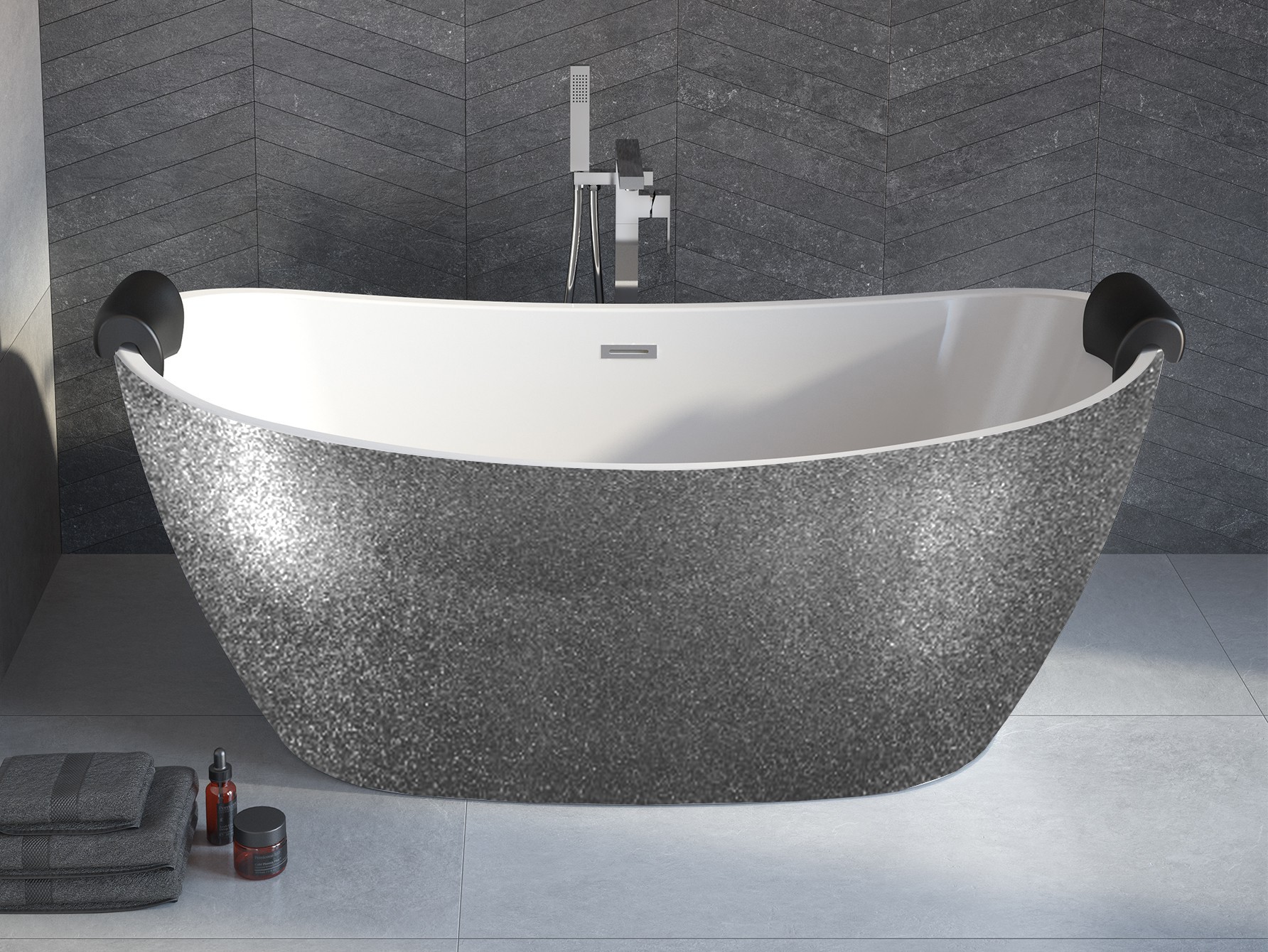 Oblé tvary, robustní a asymetrický vzhled, to je vana AYLA GLAM. Díky hmotnosti je manipulace s vanou velmi snadná. Vana i vnější plášť tvoří kompaktní celek. Čelní strana je provedena ve GLAM02 stříbrné barvě, horní a vnitřní část vany v bílé barvě. Akrylátový povrch vany umožňuje jeho snadnou údržbu. Vanu není třeba obezdívat a obkládat. Součástí vany je také odtokový systém click-clack s přepadem v chromu ve standardním provedení. Dále nabízíme tyto sifony za příplatek v dalších 4 barvách (zlatá, černá, bílá a grafitová).
