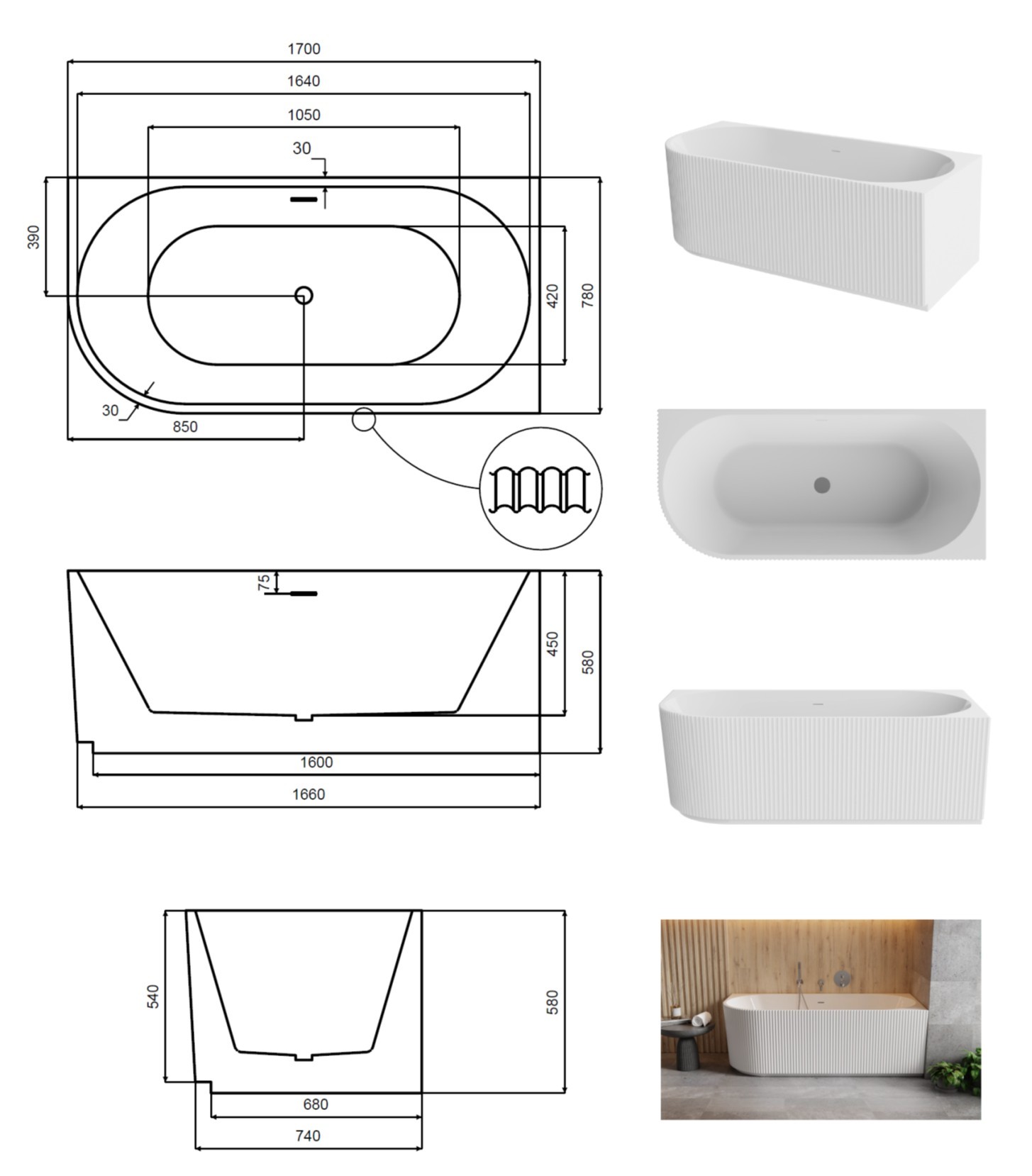 - 170 × 78 x 58 cm, objem 260 l, hmotnost prázdné vany 56 kg