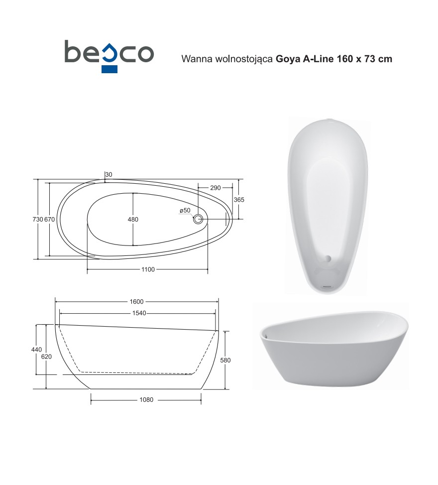 57 290,00 CZKvana volně stojící GOYA A-LINE, 1600 × 730 mm, GLAM01 zlatá barva/bílá barva, sifon černá barva