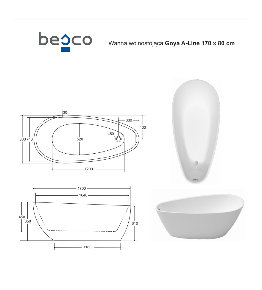 38 490,00 CZKvana volně stojící GOYA A-LINE, 1700 × 800 mm, bílá barva, sifon grafitová barva
