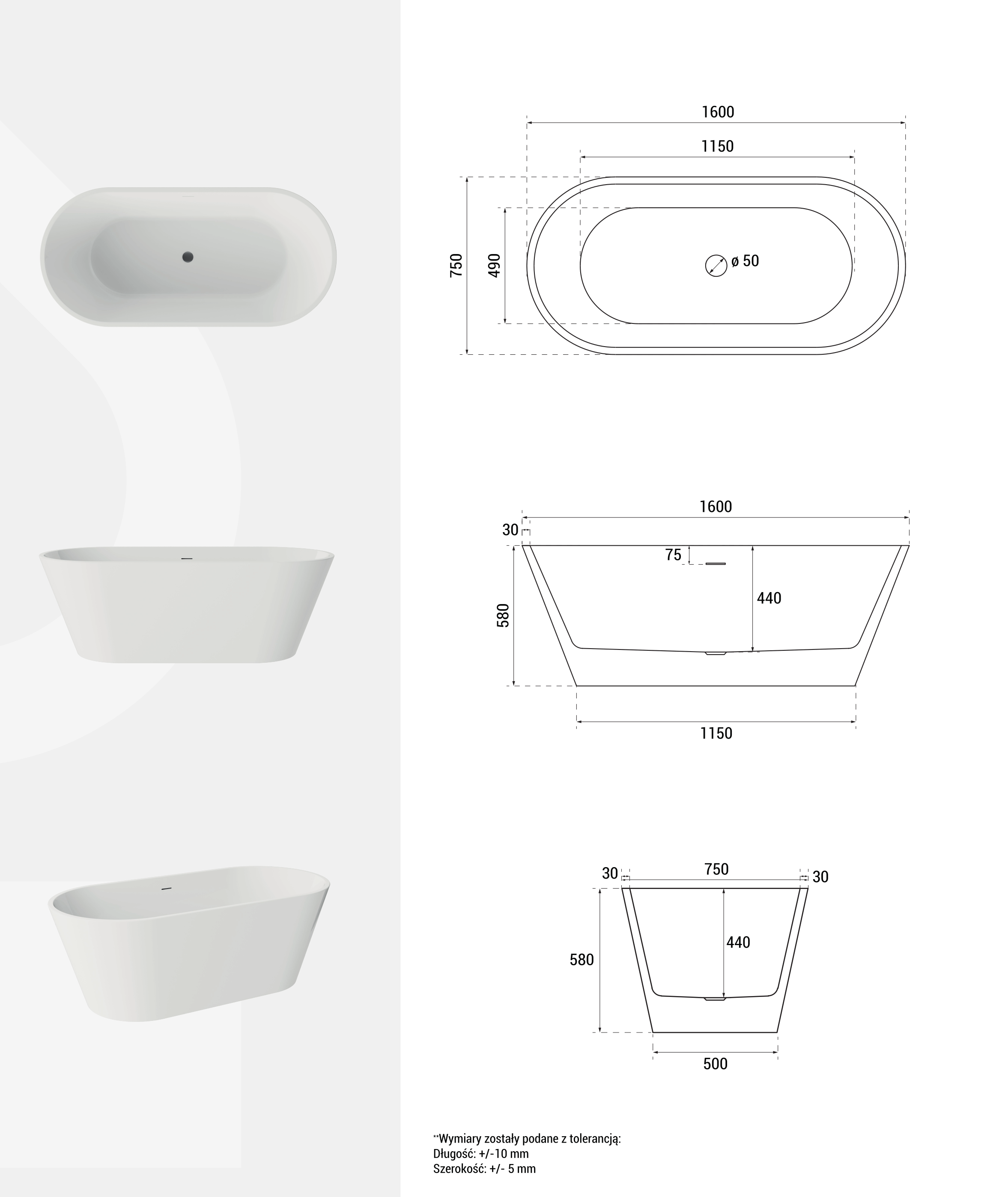 22 290,00 CZKvana volně stojící ze sanitárního akrylátu DEEVA, 1600 × 750 mm, bílá barva, sifon grafitová barva