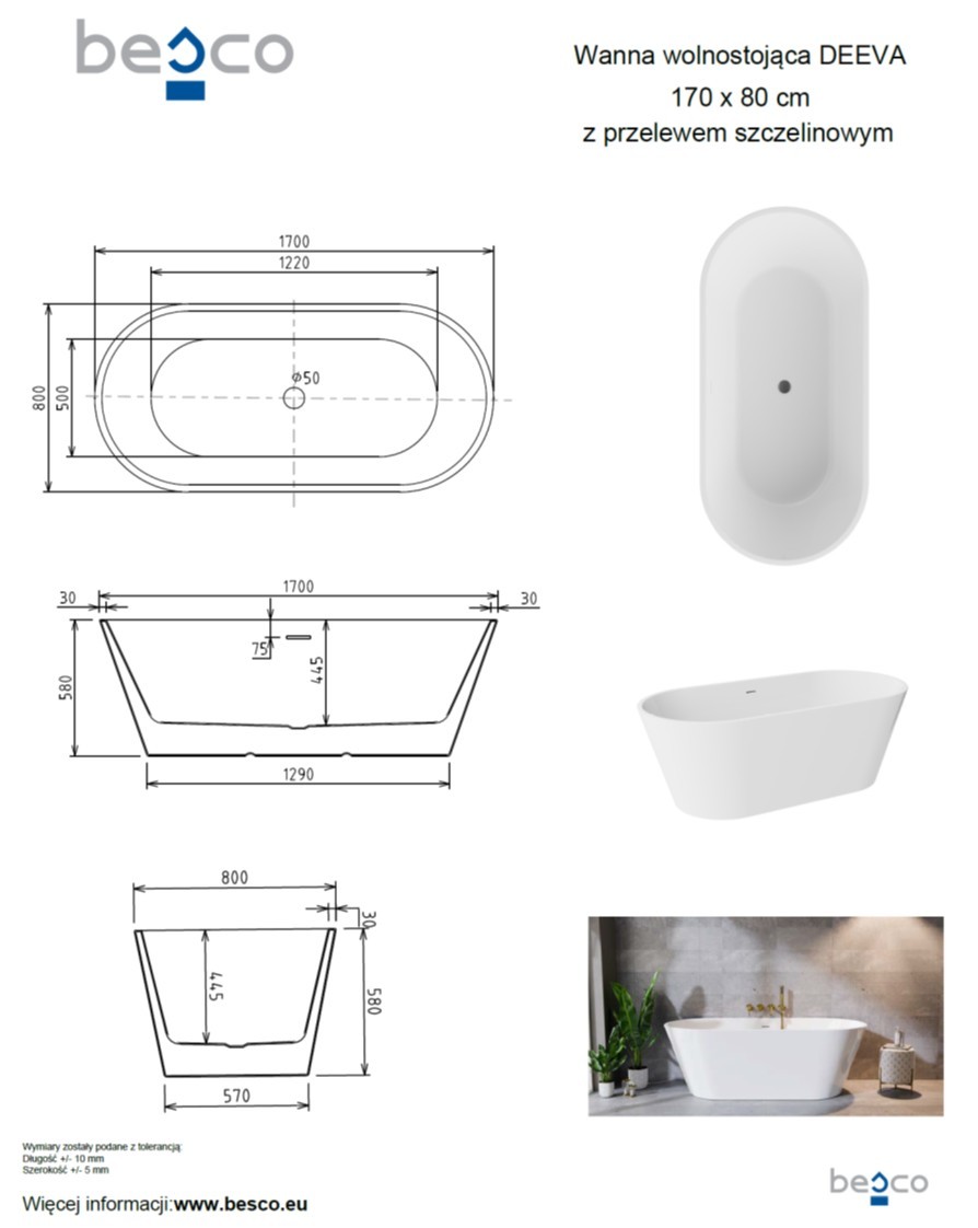 22 990,00 CZKvana volně stojící ze sanitárního akrylátu DEEVA, 1700 × 800 mm, bílá barva, sifon chrom