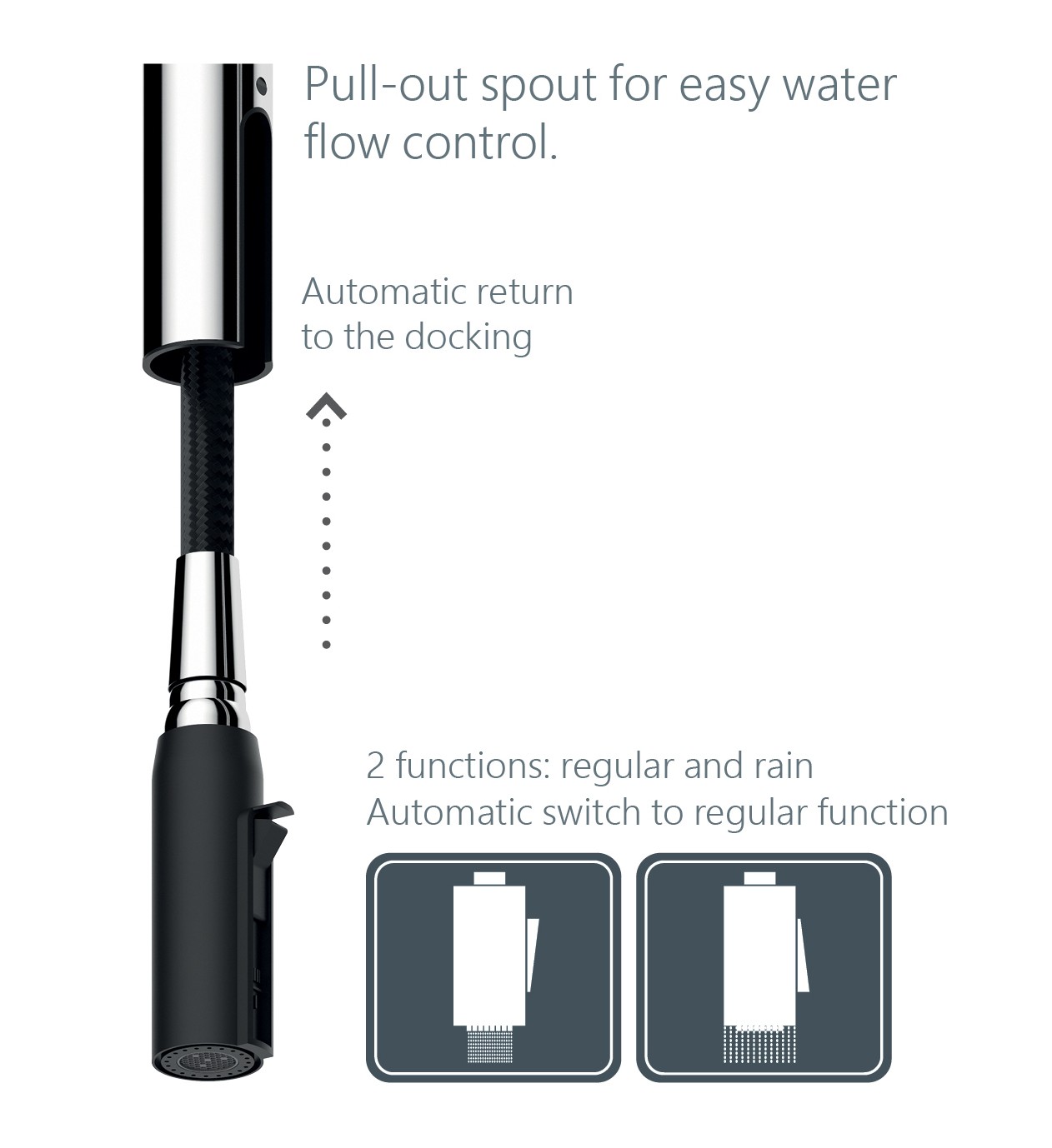 - Výsuvná 2-polohová sprška vám nabízí vysokou flexibilitu při čištění pánví, hrnců a každého rohu dřezu. Díky velkému rozsahu pohybu můžete bez omezení plnit nádoby jakéhokoli typu a velikosti.