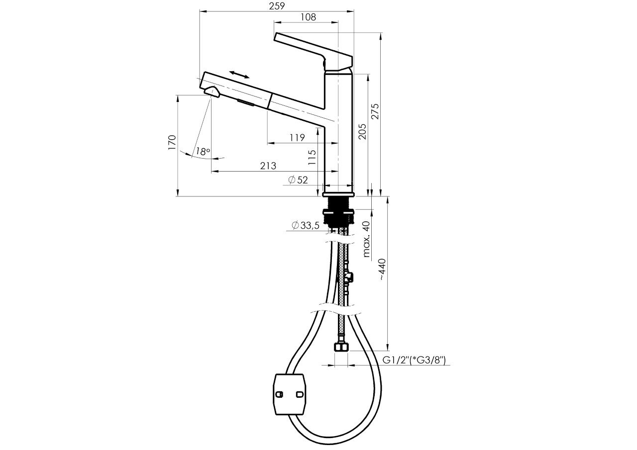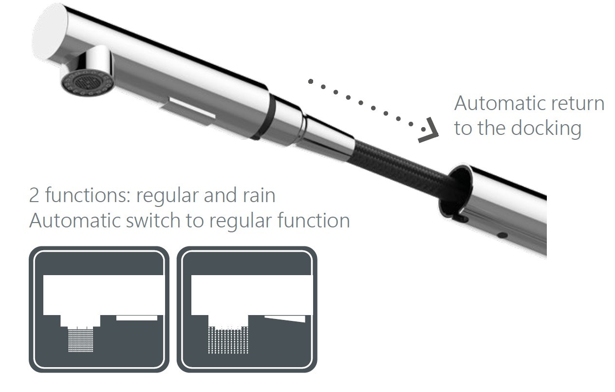 • Výsuvná 2-polohová sprška vám nabízí vysokou flexibilitu při čištění pánví, hrnců a každého rohu dřezu. Díky velkému rozsahu pohybu můžete bez omezení plnit nádoby jakéhokoli typu a velikosti.