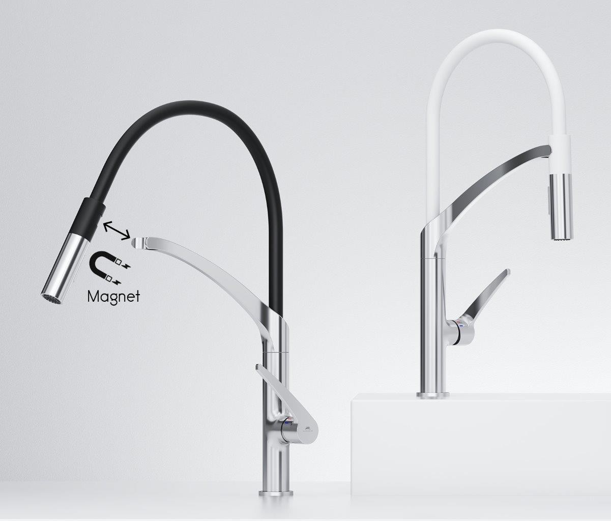 - Flexibilním masivní rameno se sprškou v bílé barvě, uchycování spršky pomocí magnetu
