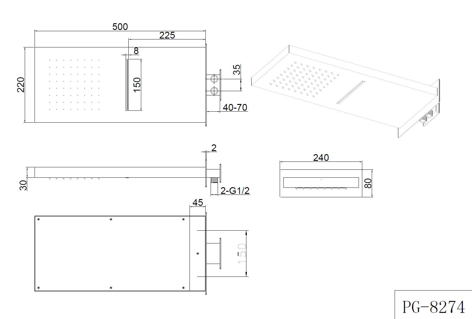 Nástěnné sprchy nabízíme ve jedné variantě a to s kaskádovým přílivem vody a klasickou hlavovou sprchou. Hlavové sprchy ke své funkci potřebují podomítkovou baterii bez přepínače. Pokud má hlavová sprcha i kaskádový příliv vody tak s dvoucestným přepínačem. V případě, že chcete využívat ještě ruční sprchu, doporučujeme použít baterii třícestnou, nebo přidat k dvoucestné baterii ještě baterii jednocestnou nebo použít tři jednocestné baterie pro každou funkci zvlášť. Hlavové sprchy zachycují dynamiku vody. Vzhled, který nikdy nezevšední a kvalita použitých materiálů Vám přinesou jistotu správné volby hlavové sprchy pro Váš domov. Sprcha je vyrobena z kvalitní nerezové oceli s vysokým leskem a s úpravou trysek (ANTI CALK) pro snazší údržbu.