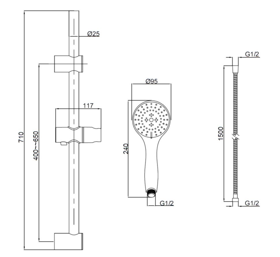 - Příslušenství: sprchová hlavice, hadice, posuvný držák sprchy, instalační materiál
