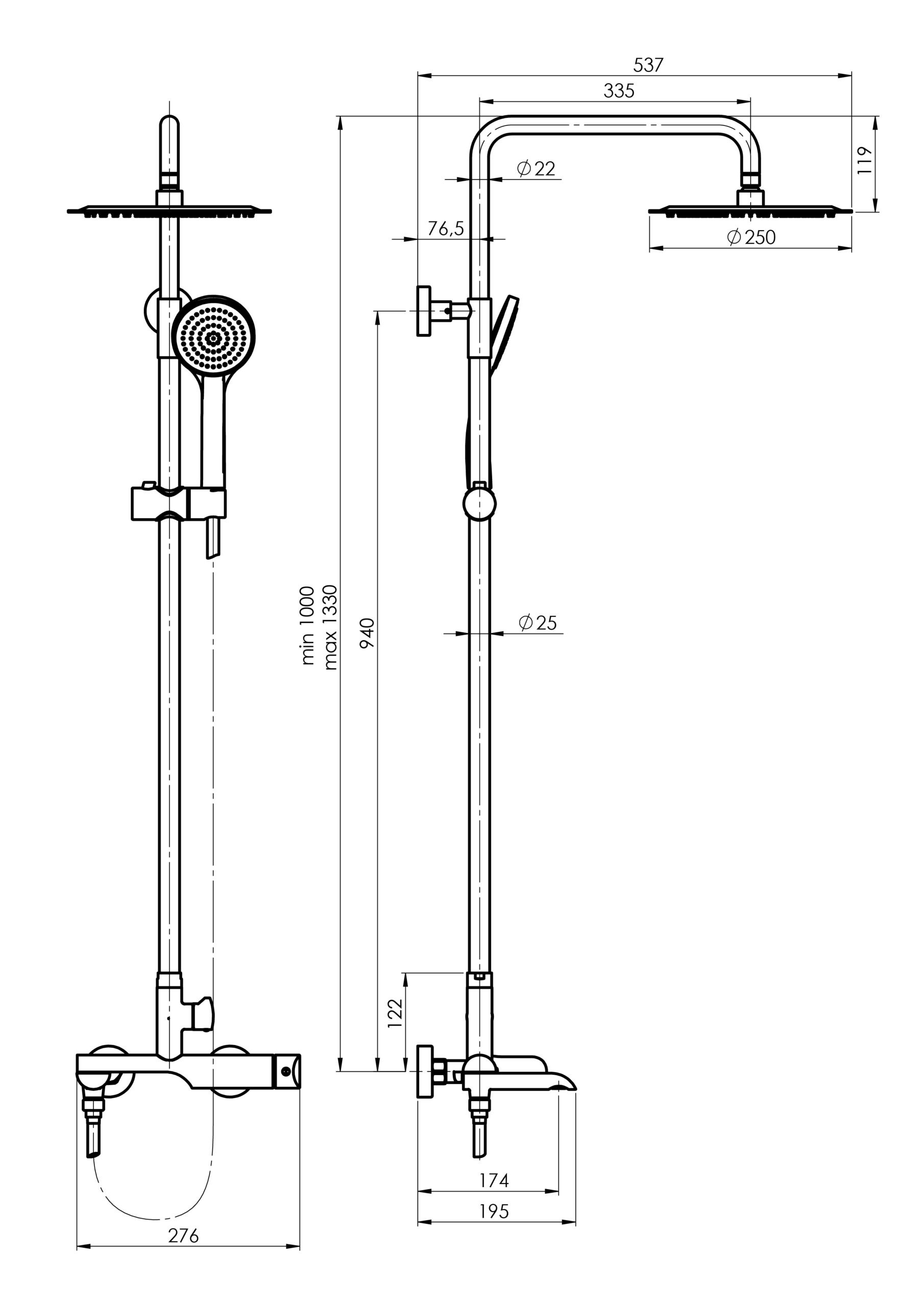 - Regulovatelná výška hlavové sprchy 881 - 1211 mm
