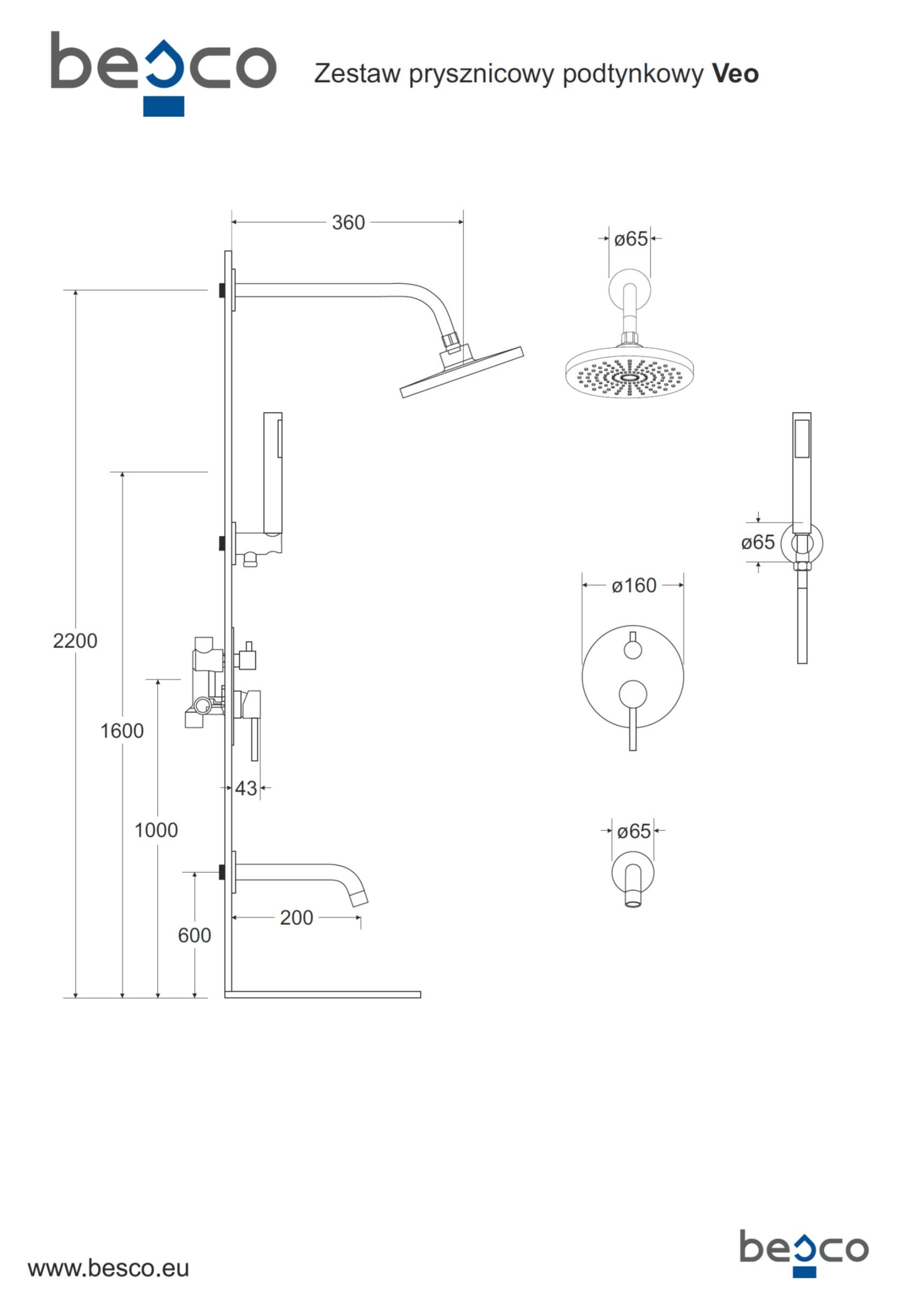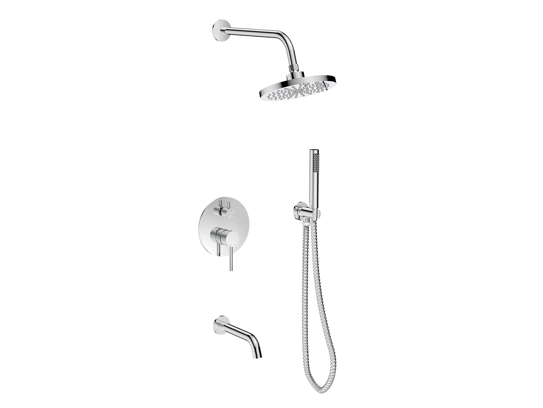 - Set obsahuje podomítkovou baterii, vývod ze stěny s držákem, včetně ruční sprchy a hadice, dále držák a kulatou hlavovou sprchu a stěnový vývod