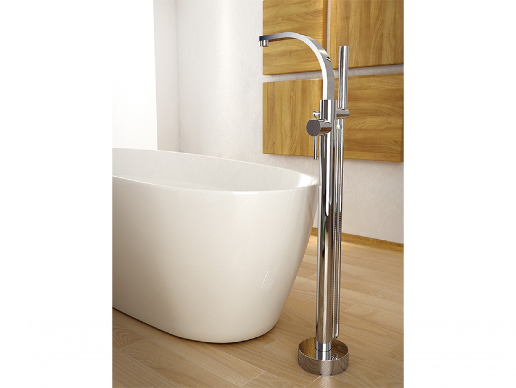 Stojánková baterie do podlahy vypadá skvěle v kombinaci s volně stojící vanou.