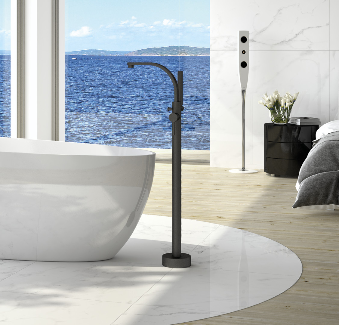Stojánková baterie do podlahy vypadá skvěle v kombinaci s volně stojící vanou.
