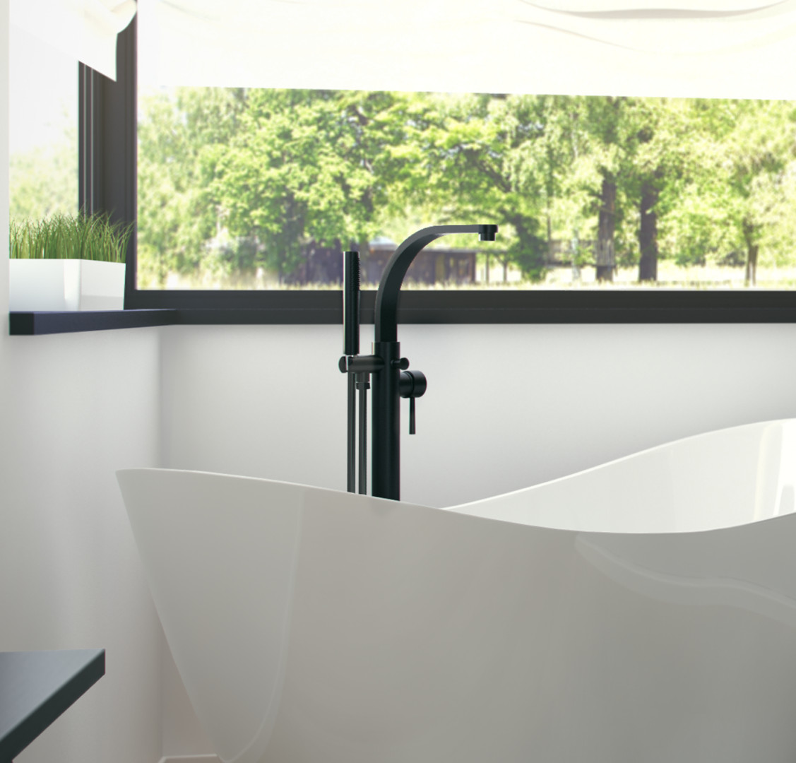 Stojánková baterie do podlahy vypadá skvěle v kombinaci s volně stojící vanou.