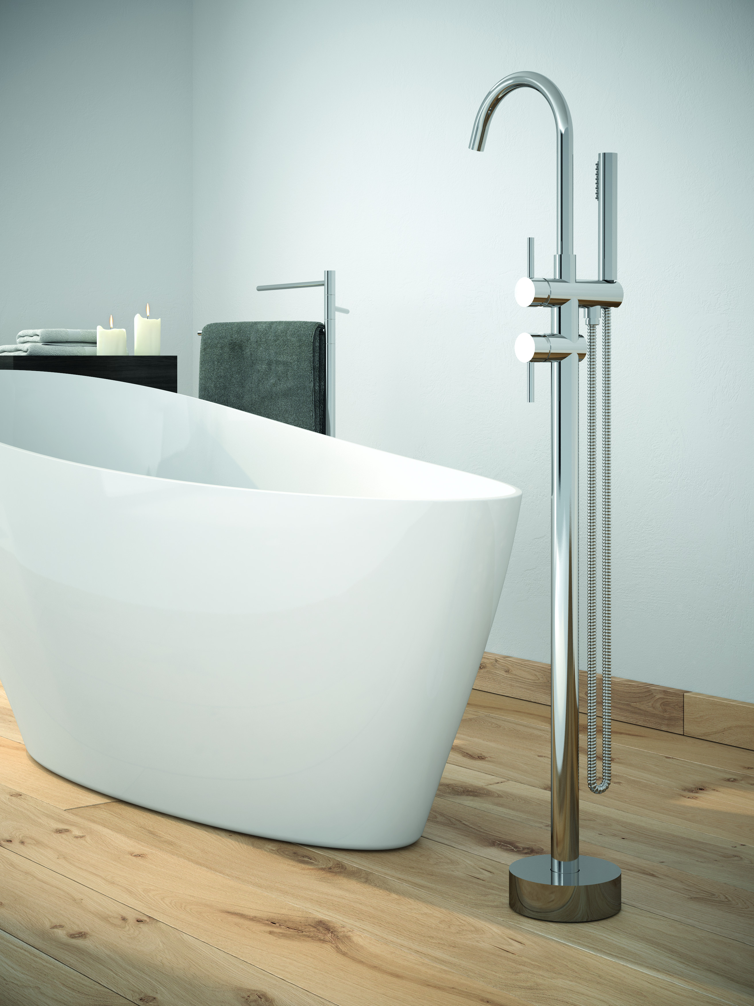 Stojánková baterie do podlahy vypadá skvěle v kombinaci s volně stojící vanou.