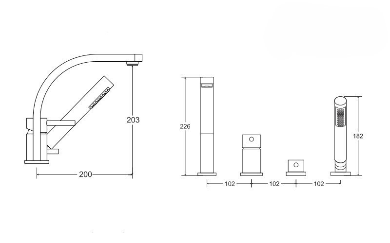 - Příslušenství: ruční sprcha, sprchová hadice, sprchový držák, přepínač proudu, kohoutek a baterie